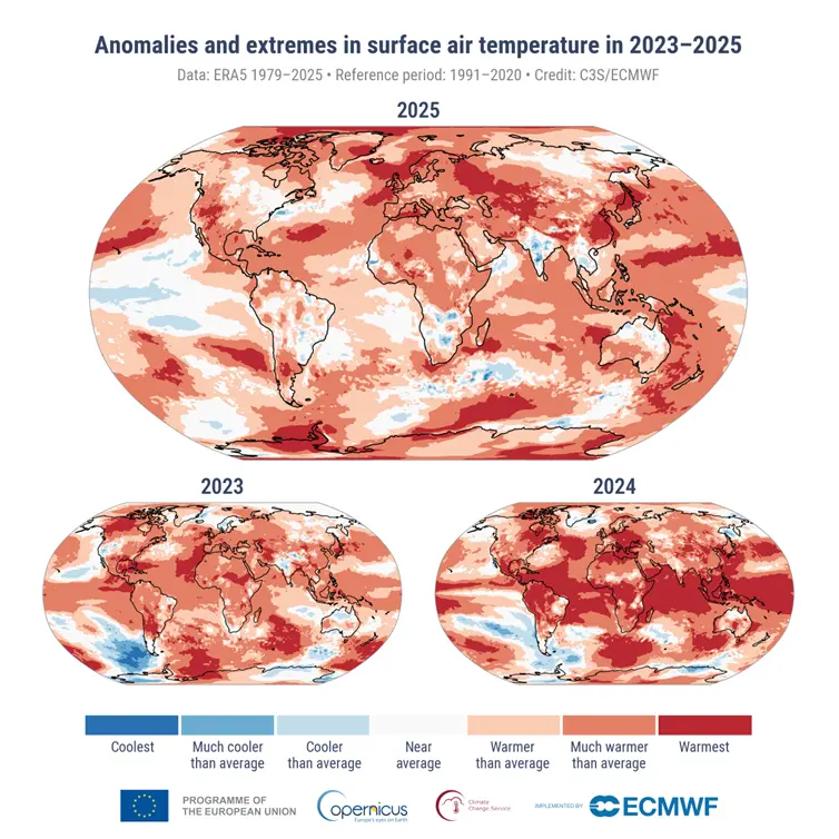El 2025 fue uno de los 3 años más cálidos a nivel mundial desde que se tienen registros. Según el Servicio de Cambio Climático de Copernicus (C3S), una iniciativa conjunta de la Comisión Europea y la Agencia Espacial Europea, 2025 es el tercer año más cálido a nivel mundial, solo 0,01 °C más frío que 2023 y 0,13 °C más frío que 2024, el año más cálido jamás registrado hasta el momento.