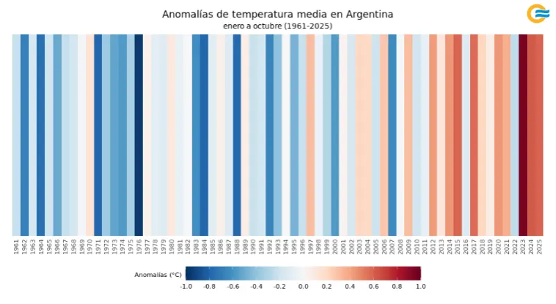 De acuerdo a datos preliminares del Servicio Meteorológico Nacional (SMN), la temperatura media del país superó el promedio 1991-2020, ubicando al período enero-octubre de 2025 como el 4° más cálido desde 1961.