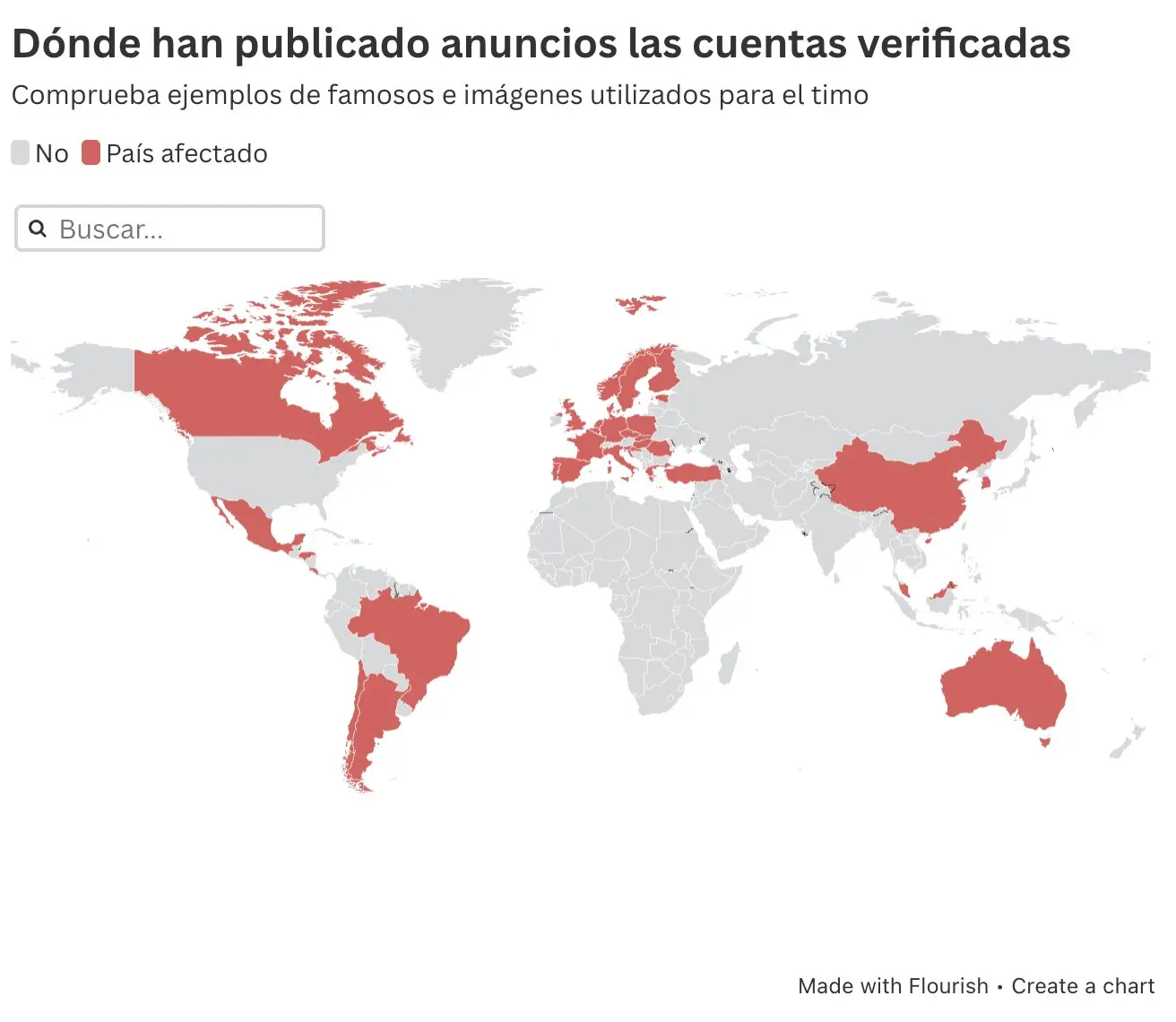 Estas cuentas publicaron anuncios dirigidos a al menos 33 países diferentes, por ejemplo, Chile o Malasia, o miembros de la UE como Portugal, Rumanía o Suecia, usando la imagen de más de 150 personas famosas en esos lugares (muchas de ellas fallecidas recientemente) y de distintos medios de comunicación nacionales. Normalmente, una misma cuenta comparte anuncios para varios países, mientras la información de transparencia de Meta indica que las páginas tienen administradores en países como Vietnam, Ucrania o Estonia.