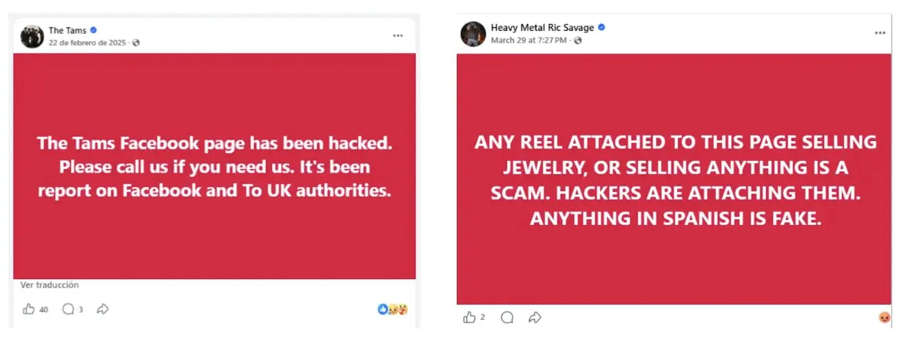 A diferencia de otras cuentas que participan en este tipo de timos y que emplean nombres de personas o medios de comunicación inventados, estas cuentas verificadas utilizan el de personas o grupos reales. Mediante hackeos o suplantaciones, los timadores aumentan la credibilidad aprovechando cuentas con nombres auténticos acompañados de la marca de verificación. Según Meta, esta insignia sólo se puede obtener pagando una subscripción a ‘Meta Verified’ o bien mediante el antiguo proceso gratuito y más exclusivo reservado a personas, marcas o entidades destacadas.