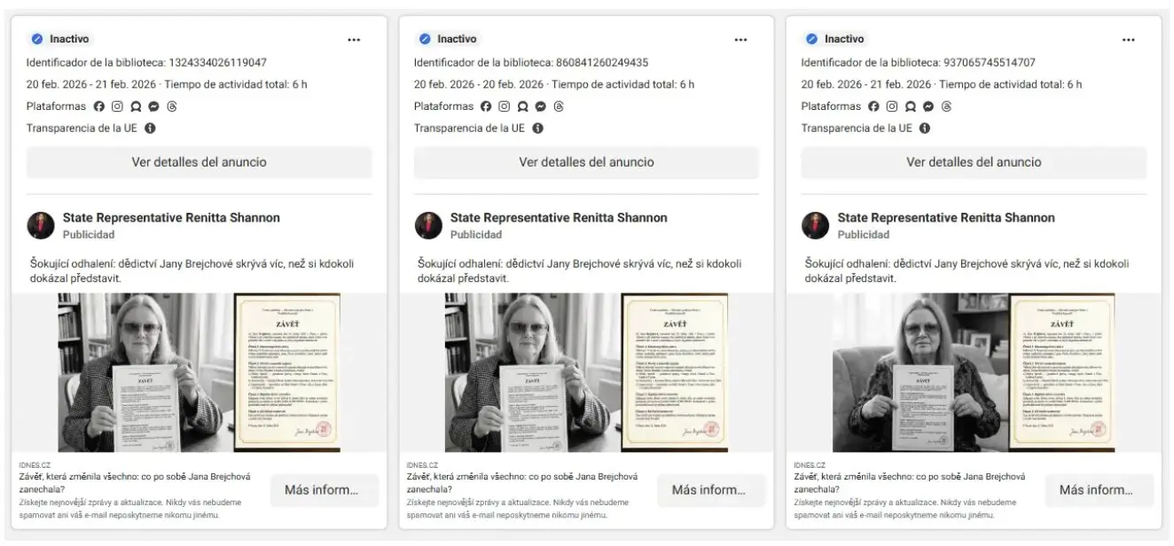 Hemos detectado 170 cuentas de Facebook con el tic azul de verificación que, en los primeros tres meses de 2026 y solamente en Europa, publicaron más de 67.000 anuncios fraudulentos según los datos del repositorio de Meta. A lo largo de todo su periodo de actividad, estas cuentas han publicado más de 110.000 anuncios sólo en el continente, aunque hemos detectado que también han publicado anuncios fuera de Europa que Meta no los incluye en su repositorio  una vez que pasan a estar inactivos.