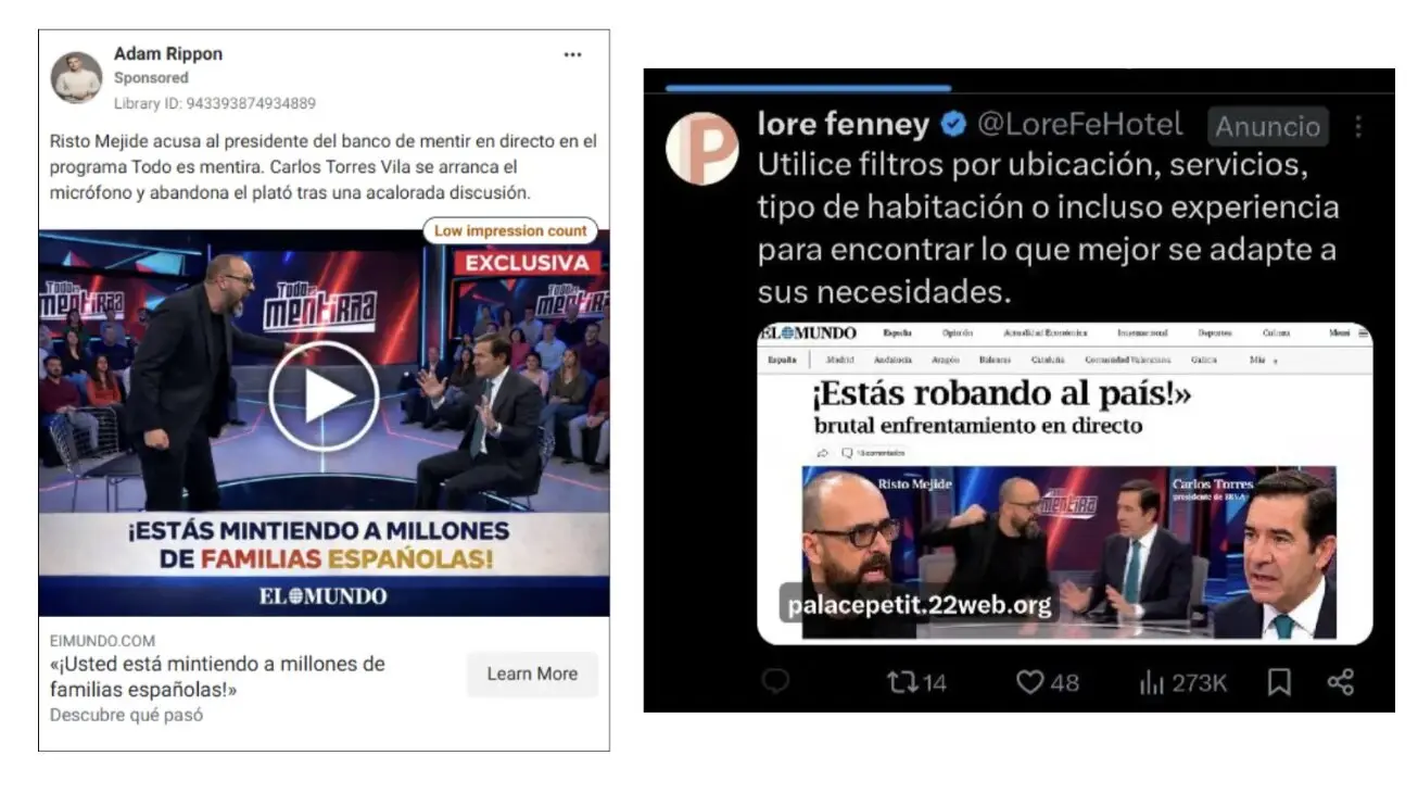 Anuncios fraudulentos similares publicados en Meta y en X