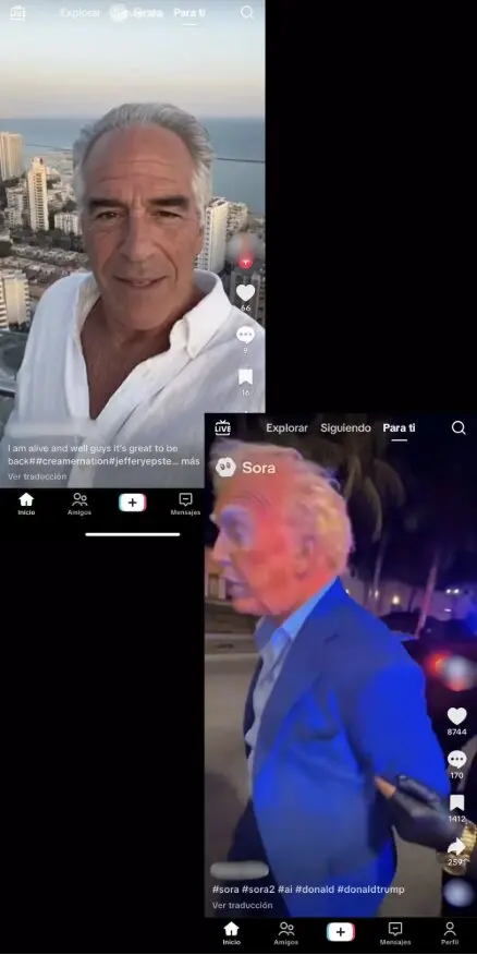 Además, que estos vídeos representen a figuras públicas puede generar falsos relatos y alterar la percepción sobre personajes y hechos reales o históricos. Por ejemplo, en TikTok circulan vídeos creados con Sora que muestran a Jeffrey Epstein diciendo que está vivo y que reside en Tel Aviv (Israel), una narrativa que forma parte de una teoría de la conspiración, o de Trump siendo detenido por reclutar mujeres para Epstein. Estos contenidos pueden servir para reforzar narrativas sobre el caso Epstein y el supuesto papel del presidente de Estados Unidos.