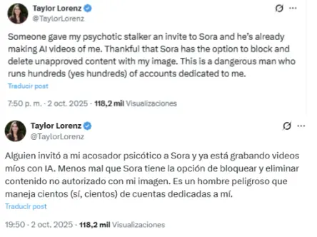 Jorge Louzao, experto en ciberseguridad y maldito que nos ha prestado sus superpoderes, dice que uno de los principales riesgos es la suplantación de identidad, ya que los deepfakes de los usuarios “se pueden difundir sin control, usarse para acosarlos, extorsionarlos o simplemente avergonzarlos, o incluso para amplificar discursos de odio, falsedades y discursos extremos”. Por ejemplo, la periodista Taylor Lorenz denunció que su acosador usó la herramienta de OpenAI para crear vídeos con IA de ella.