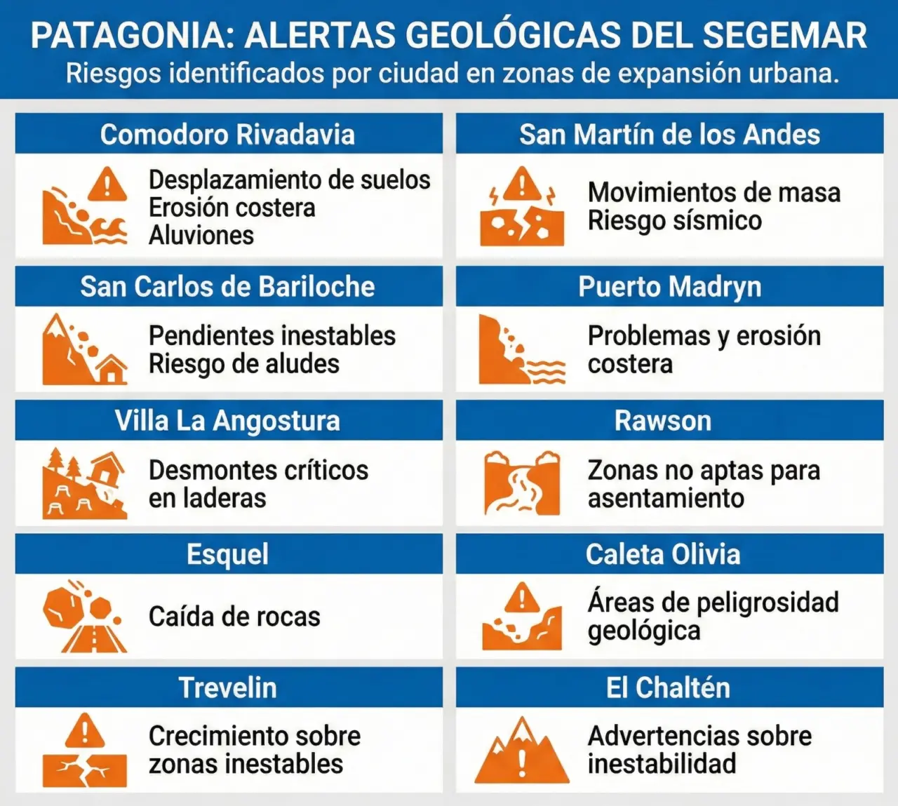 ¿En qué ciudades patagónicas el Segemar advirtió riesgos vinculados al crecimiento urbano?