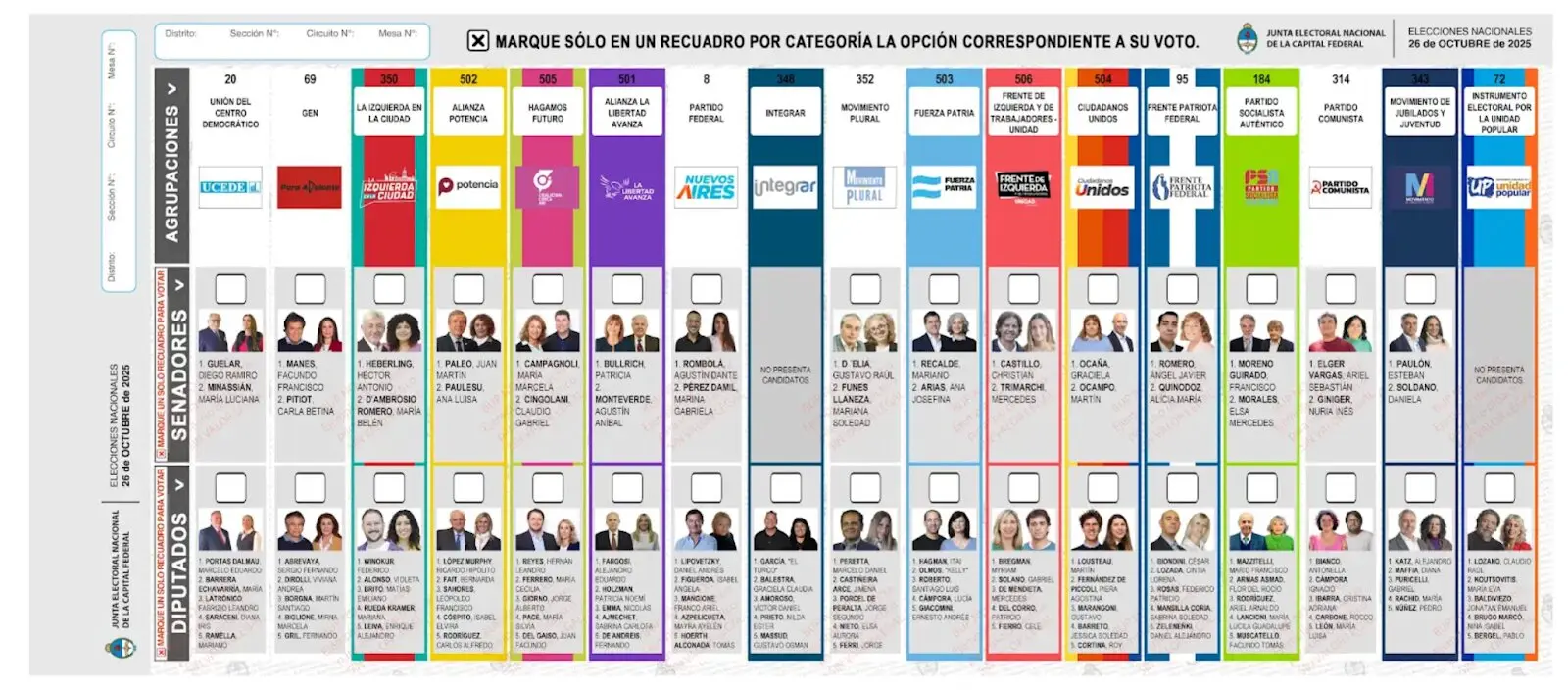 Cada elector, debe marcar el casillero correspondiente al partido político que eligió. En el caso de los 16 distritos que votan sólo senadores, la boleta tendrá sólo un casillero marcado. En el caso de votar senadores y diputados, habrá que marcar un casillero por cada uno.