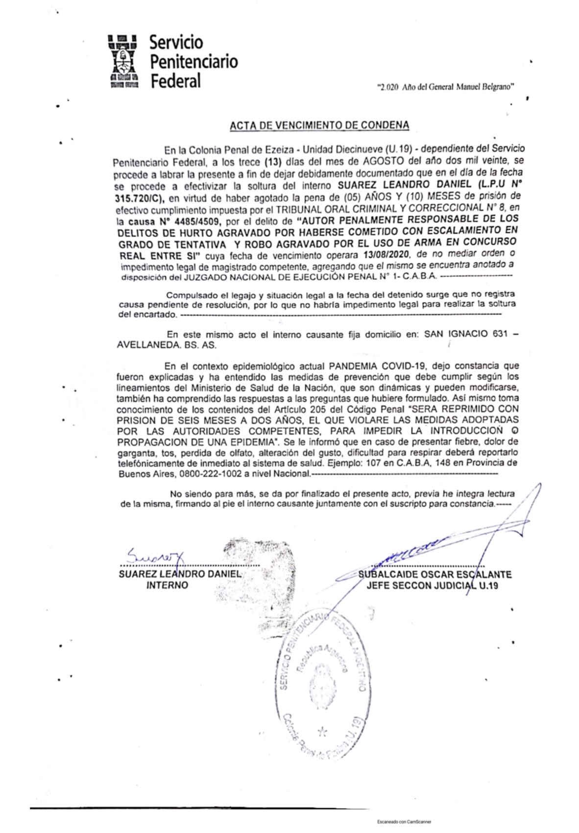Sin embargo, el acta de vencimiento de la condena -emitida por el SPF- da cuenta de que el 13 de agosto de 2020 se efectivizó la “soltura” de Suárez “en virtud de haber agotado la pena”. Es decir que cumplió en prisión los 5 años y 10 meses de pena que dispuso el tribunal.