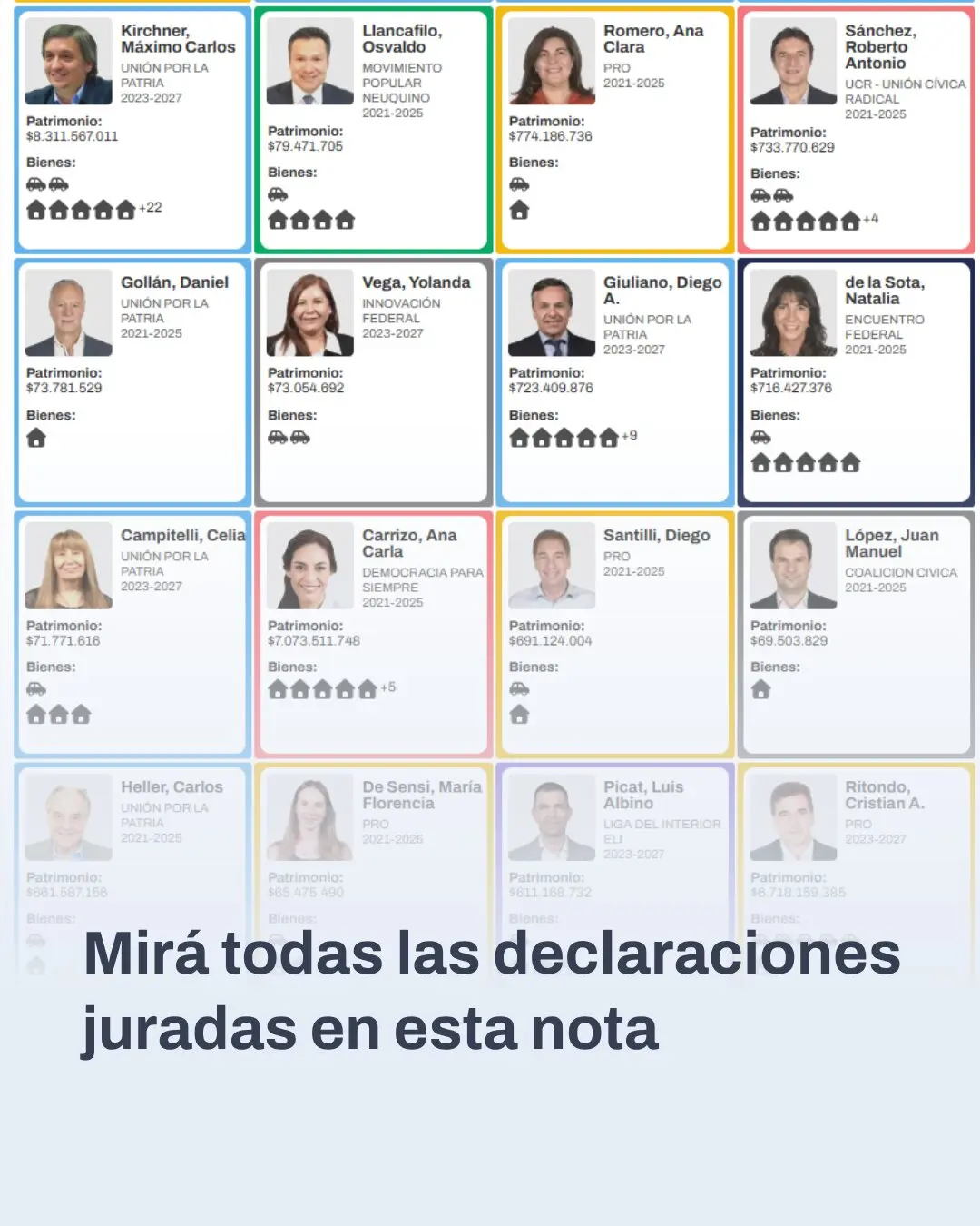 Máximo Kirchner (Fuerza Patria), Carla Carrizo (Democracia para Siempre) y Cristian Ritondo (PRO) son los 3 diputados nacionales que más patrimonio declararon, de acuerdo con un relevamiento de Chequeado sobre los 257 legisladores que ocupan una banca en la Cámara baja. Entre los primeros 10 del ranking figura el presidente del cuerpo, Martín Menem (La Libertad Avanza), según los reportes presentados ante la Oficina Anticorrupción (OA).