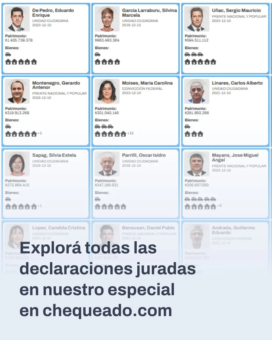 - El salteño Juan Carlos Romero (Cambio Federal) es el que más patrimonio declaró: $ 4.361 millones. Le siguen Carmen Álvarez Rivero (PRO), con un patrimonio de $ 2.222 millones, y Martín Lousteau (UCR), con $ 1.912 millones.