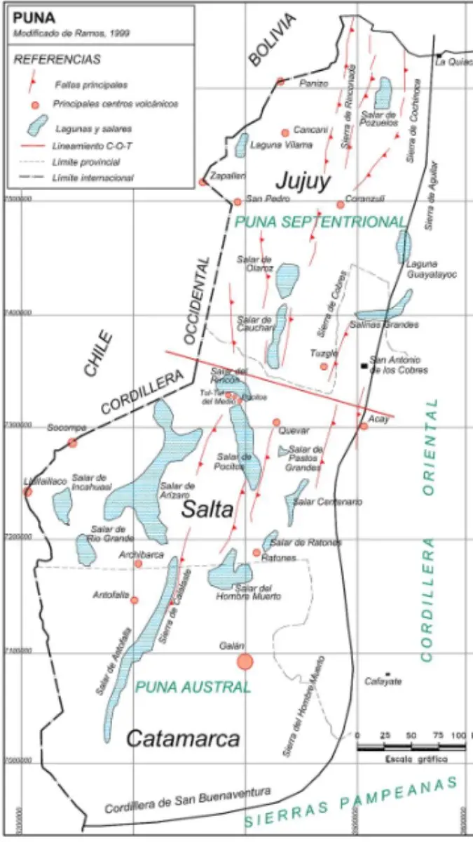 Mapa de la Puna Argentina mostrando los salares más importantes.