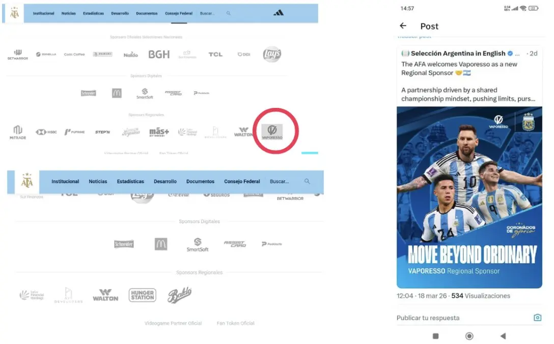 Sin embargo, tras la publicación de Chequeado, la AFA eliminó de su sitio oficial el logo de la marca, que había sido incorporada como sponsor regional. Al momento de la redacción de esta nota, Vaporesso ya no figura en ese listado. La entidad también había borrado previamente el posteo en redes sociales en el que anunciaba el acuerdo, luego de recibir cuestionamientos públicos.