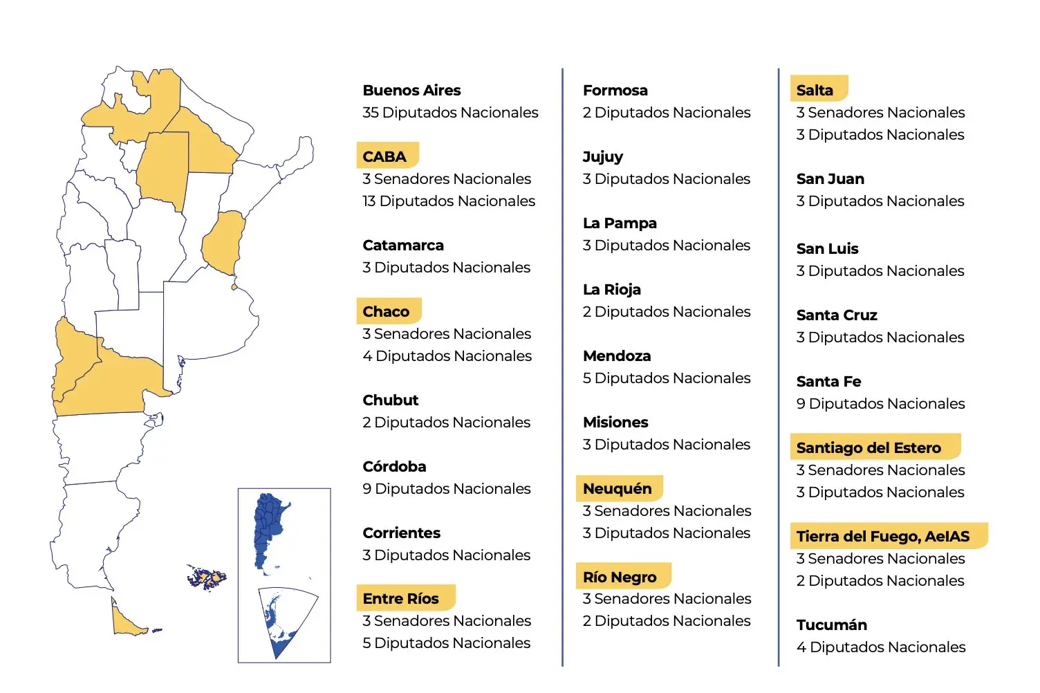 - Los 8 distritos restantes del país (Salta, Neuquén, Río Negro, Tierra del Fuego, Chaco, Santiago del Estero, Entre Ríos y Ciudad de Buenos Aires) eligen diputados y senadores nacionales. Además, 4 provincias (Catamarca, Mendoza, La Rioja y Santiago del Estero) elegirán también cargos provinciales.