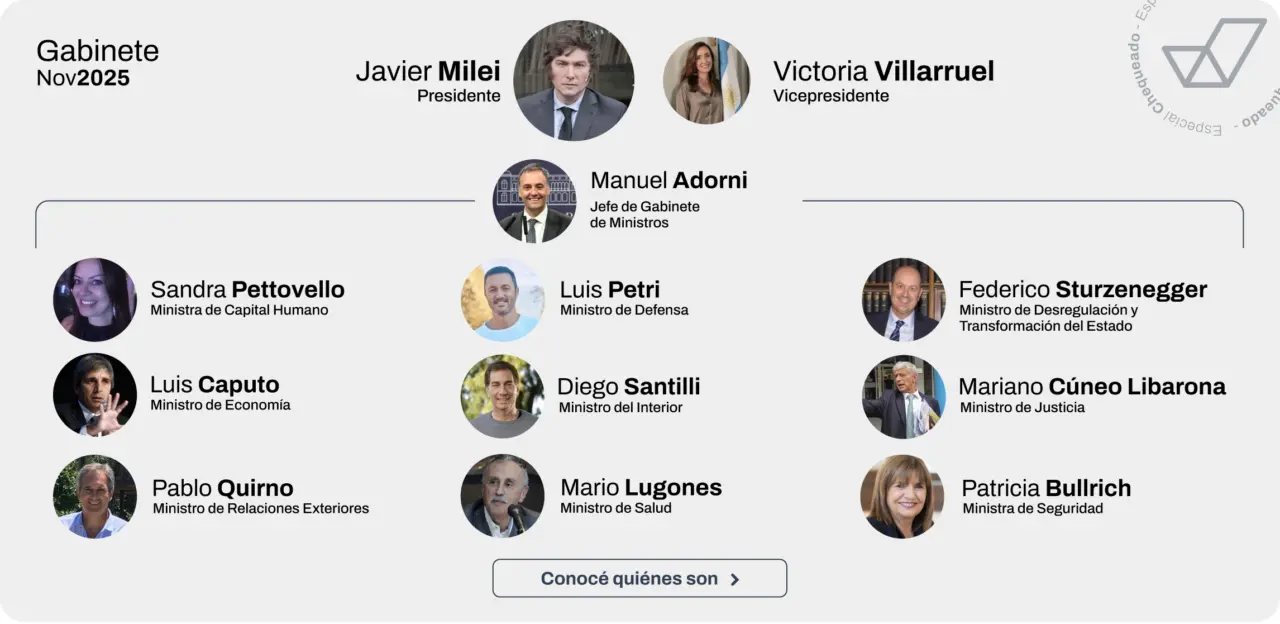 Actualización 3/11/2025: se actualizó la imagen del gabinete de Milei tras la confirmación de Diego Santilli como ministro del Interior.