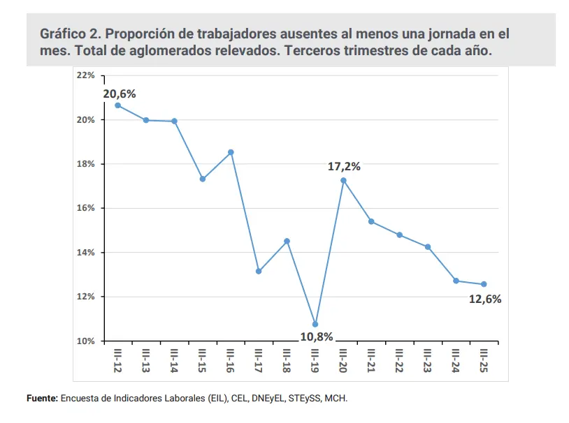 Un informe de la Secretaría de Trabajo de la Nación sobre el ausentismo laboral en el empleo asalariado registrado del sector privado muestra que en el tercer trimestre de 2025 (último dato) el 61% de las empresas del sector privado en los aglomerados urbanos relevados presentó al menos un trabajador ausente al mes. Y señala que, del total de las empresas con ausentismo, el 12,6% de la dotación de personal se ausentó durante una jornada en el mes.