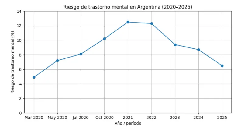 De acuerdo al estudio, el 6,5% de los argentinos tienen riesgo de padecer un trastorno mental. En 2020, el porcentaje era 4,9% (alcanzando un máximo de 12,51% durante ese año, es decir, durante la fase más aguda de la pandemia).