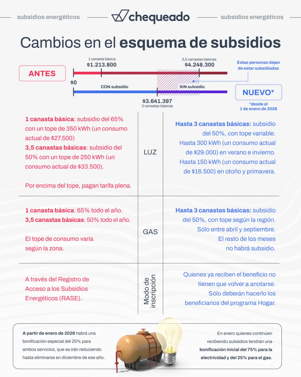 - El Gobierno nacional anunció la reestructuración del sistema de subsidios a partir del 1º enero de 2026, por la cual algunos usuarios dejarán de recibir el beneficio y pagarán el precio pleno de la energía, y quienes los mantengan recibirán aumentos.