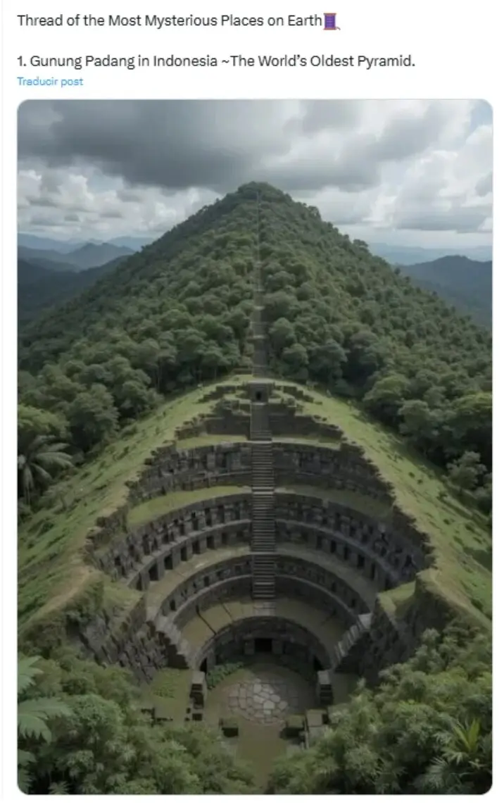 Ejemplo de ello son las imágenes virales del yacimiento arqueológico de Gunung Padang en Indonesia. Circulan en Twitter (ahora X) (donde tiene por lo menos 30,9 millones de visualizaciones), Facebook e Instagram. En esta última red social la comparte una asociación de turismo.