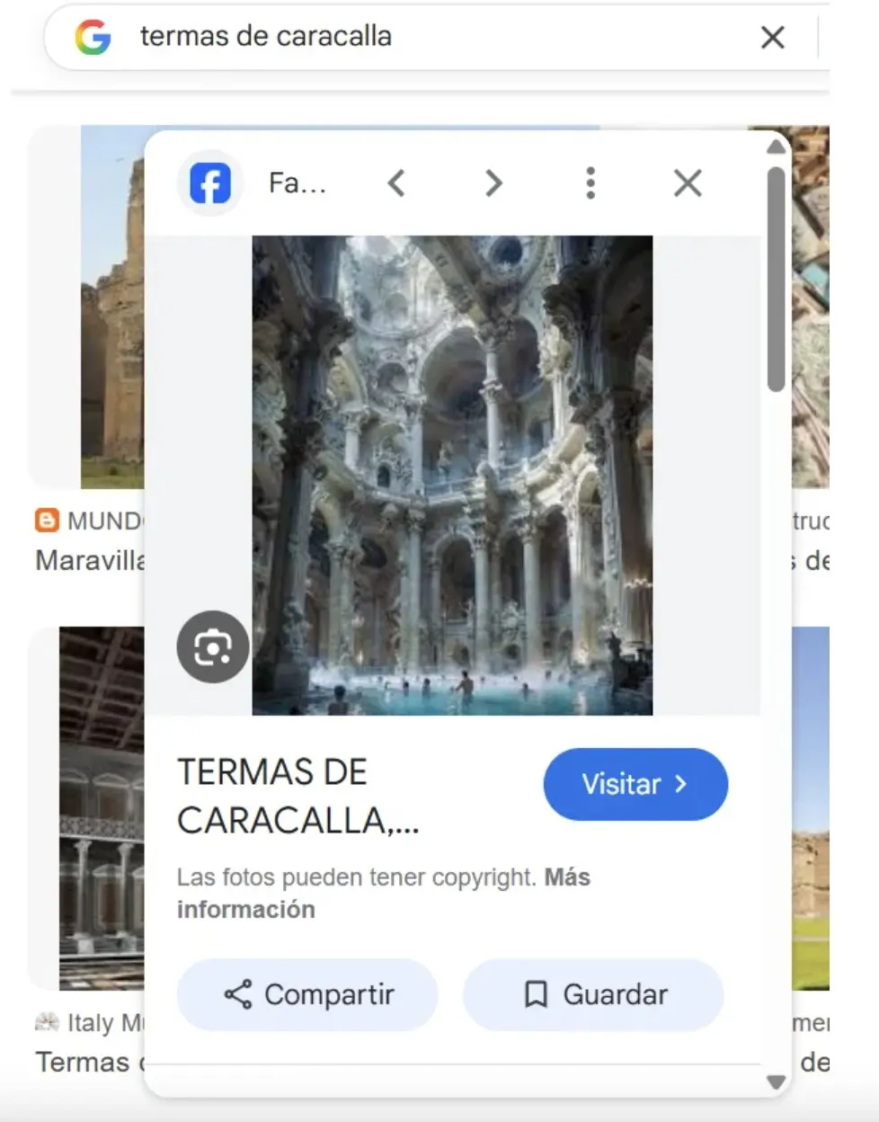Lo mismo sucede con las Termas de Caracalla, ruinas ubicadas en Roma (Italia). Si buscamos este lugar histórico en Google, entre los resultados aparece una imagen que muestra una construcción en perfecto estado y con las supuestas termas funcionando, incluso con personas bañándose.