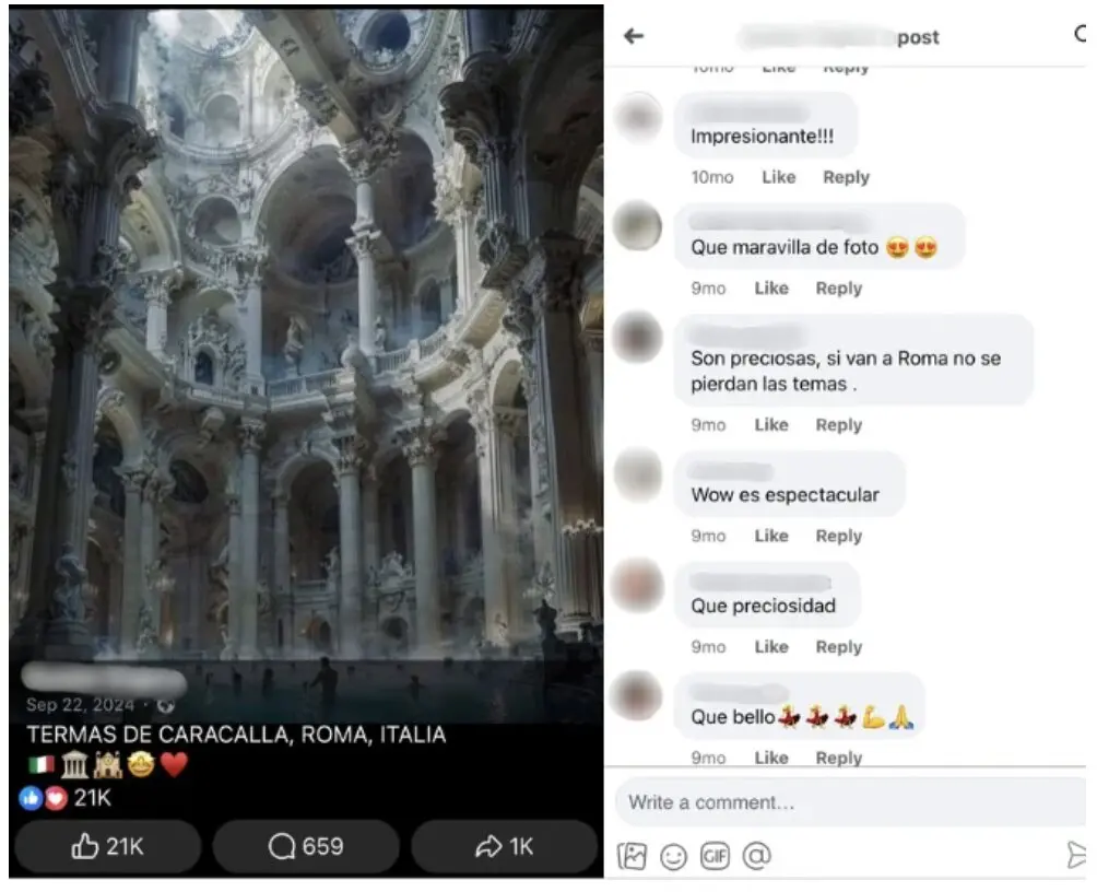 - En redes sociales y sitios web circulan contenidos creados con IA de destinos turísticos y sitios históricos que se comparten como reales. Algunos son publicados por perfiles y webs que se dedican al turismo o al contenido sobre viajes