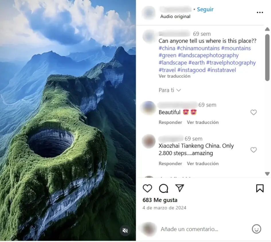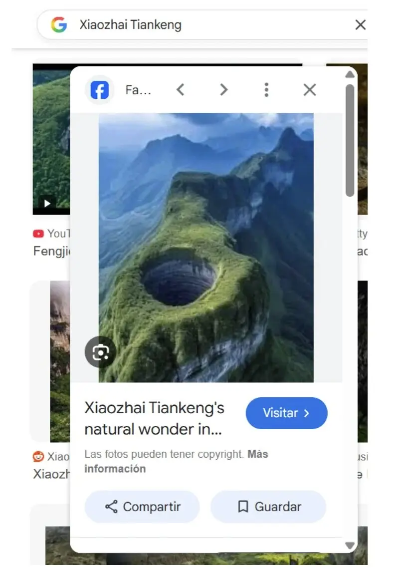 Otro ejemplo es Xiaozhai Tiankeng, el pozo más grande del mundo con 660 metros de profundidad, ubicado en el condado de Fengjie, China. En TikTok, Threads, X e Instagram (donde también lo comparte una página de turismo) se mueve un vídeo y capturas del mismo que muestran que este pozo está supuestamente ubicado en una cadena montañosa aislada, sin rastro de casas ni carreteras cerca. Las imágenes también están indexadas en Google, donde aparecen entre los primeros resultados cuando buscamos el lugar.