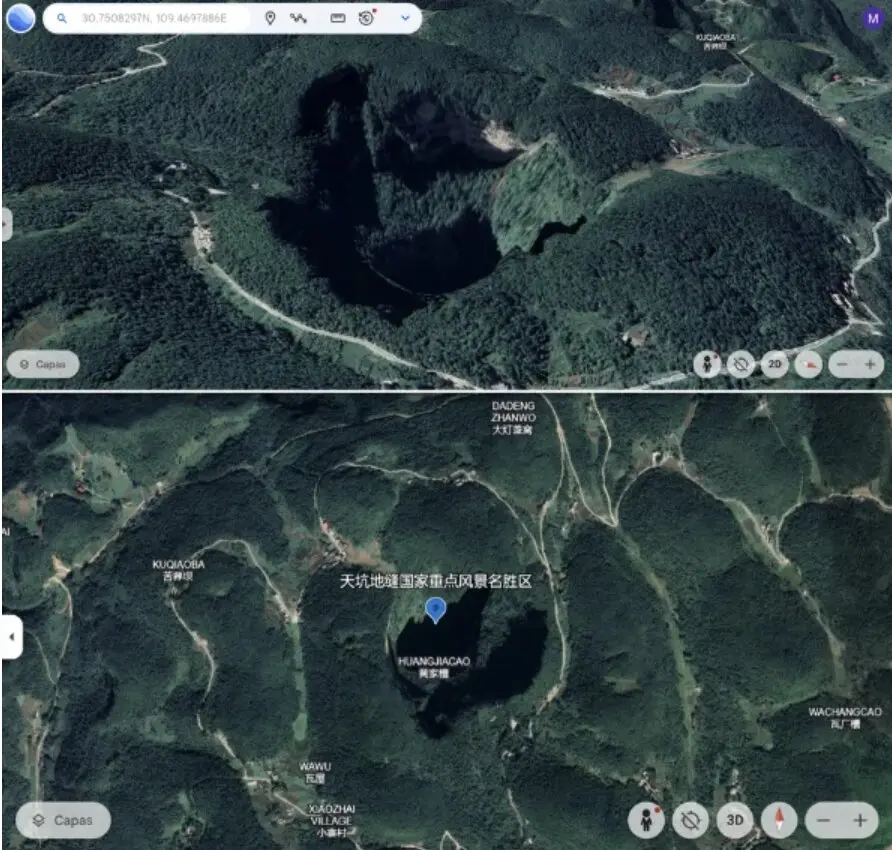 Pero las imágenes de Google Earth revelan que el vídeo viralizado no es real. La parte más alta de Xiaozhai Tiankeng tiene casas y carreteras a su alrededor, no se encuentra en una cadena montañosa aislada. Un vídeo de la BBC también muestra cómo el interior del pozo está lleno de vegetación y desciende en capas, a diferencia de la imagen viral, donde el pozo es circular y más liso.