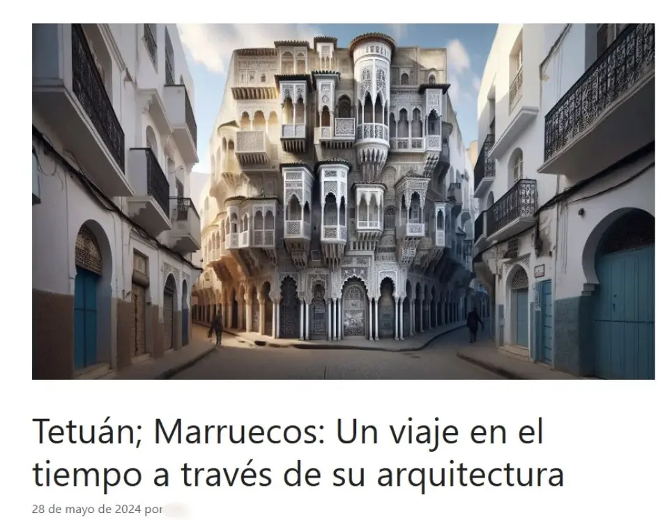 También podemos encontrar estos contenidos en páginas web. Por ejemplo, un artículo sobre Tetuán publicado en la web de una agencia de viajes a Marruecos incluye una imagen de portada con indicios de haber sido creada con IA. En la imagen aparece un edificio con múltiples balcones y ventanas, y dos figuras humanas que transitan las calles a su alrededor.