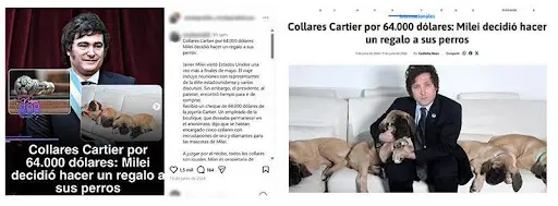 Otra línea de propaganda buscó explotar la extravagante relación de Milei con sus perros. “Objetivo y descripción: inyectar una noticia sobre Milei comprando 5 collares para perros de Cartier por valor de US$ 64 mil en EE.UU.”, dice uno de los documentos. No hay referencias sobre dónde se publicó esto, pero un artículo idéntico apareció en un sitio web de República Dominicana y en una publicación de Instagram.