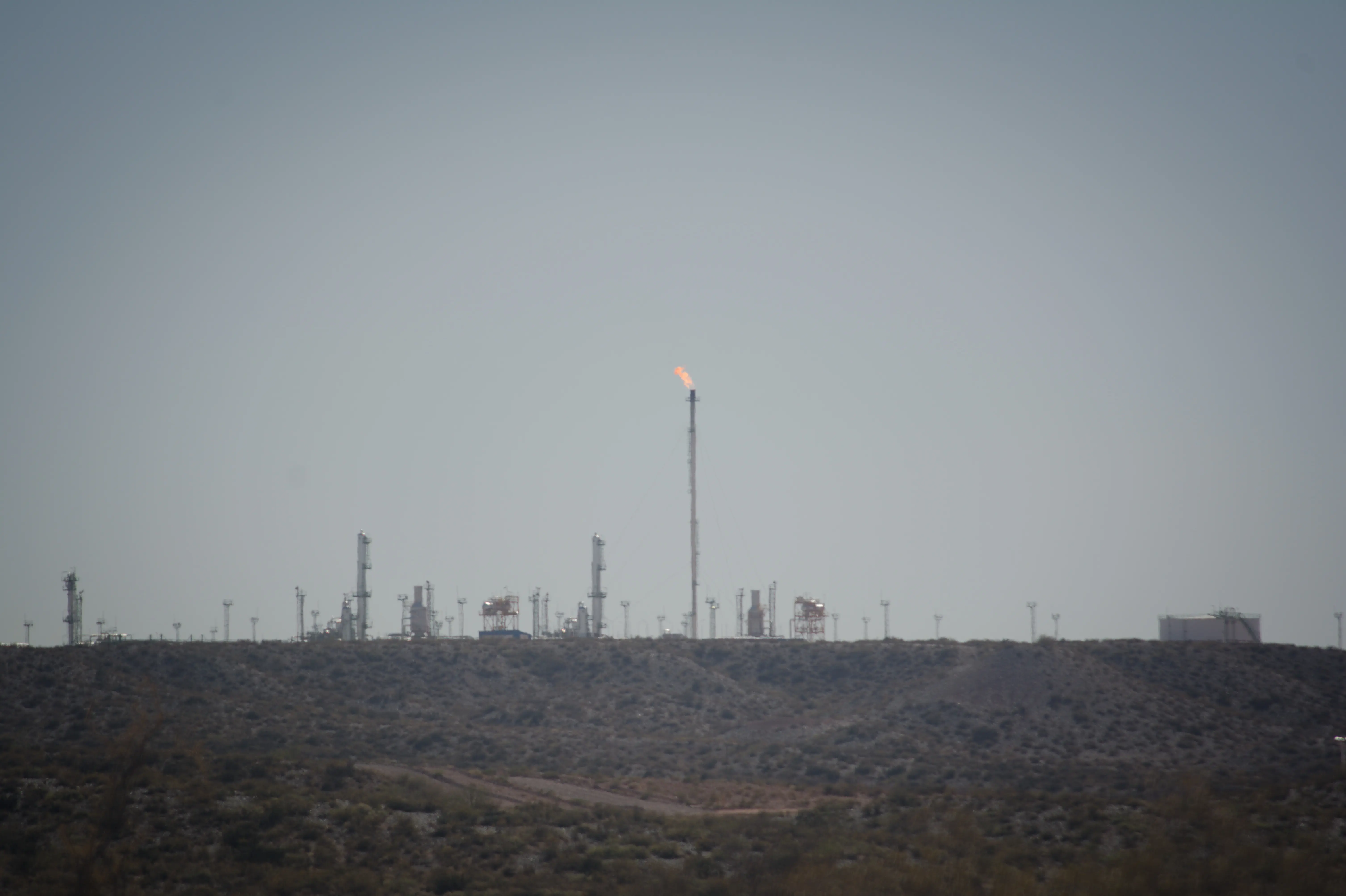 El desierto se corta con los yacimientos. Algunas cigüeñas bombean el petróleo, y se divisan las torres de gas de venteo. Forman una fina línea vertical en el horizonte, con llamaradas que se ven a la distancia, incluso con el sol del mediodía.