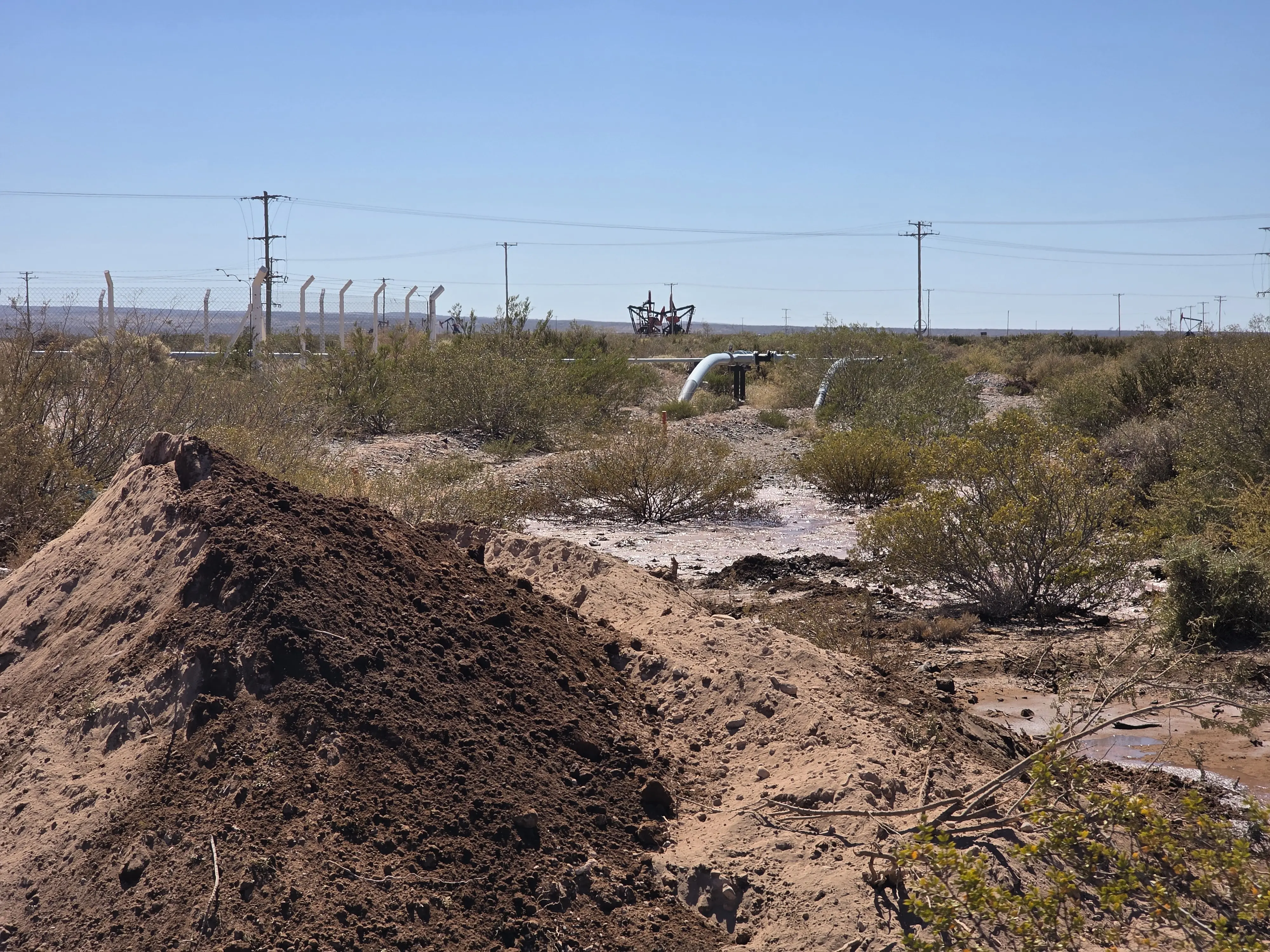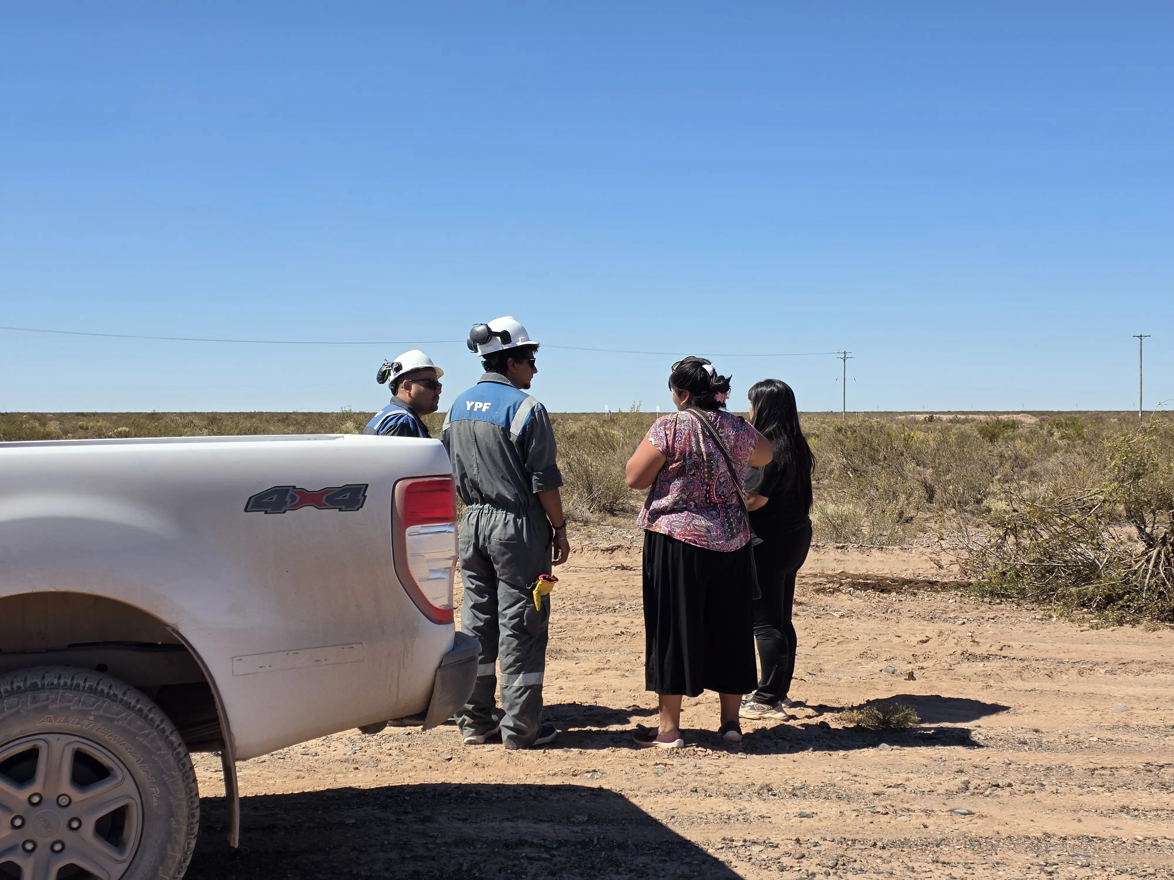 Cuentan que esa mañana descubrieron, muy cerca, un derrame de petróleo. Acompañamos a verlo en su camioneta, por caminos que bordean tranqueras y alambrados bajos. Ya en el lugar, 4 operarios de la empresa YPF trabajaban para cubrir el derrame, bajo la mirada atenta de 2 mujeres de la comunidad.