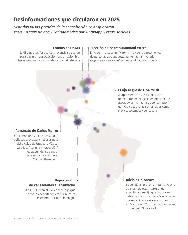 - El medio Factchequeado revisó los contenidos virales identificados en 2025 por el Instituto Democracia Digital de las Américas (DDIA) -en grupos públicos de WhatsApp y Telegram- para rastrear de qué se habla en las comunidades latinas y destacar qué casos puntuales de historias falsas hicieron un recorrido viral entre fronteras.