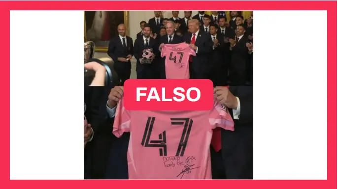 Pero la imagen es falsa: se trata de un montaje. Si bien es cierto que Messi le entregó una camiseta con el número 47 a Trump, la prenda no llevaba ningún autógrafo ni dedicatoria, tal como se observa en imágenes compartidas por la Casa Blanca y medios de comunicación.