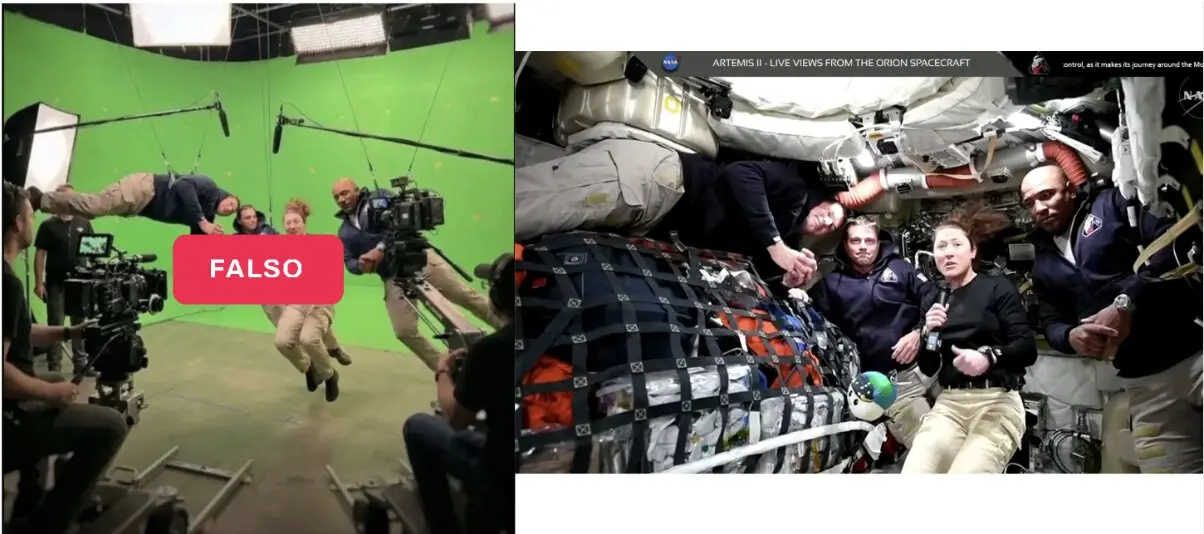Circula en redes sociales una foto de los 4 astronautas que viajaron en la misión Artemis II en un estudio de grabación con un fondo verde (técnica cinematográfica donde después se le pueden incluir imágenes en postproducción). Los astronautas aparecen agarrados con arneses para simular supuestamente que están flotando.