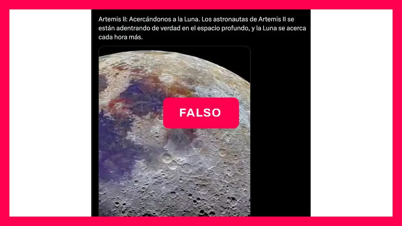 - Circula un supuesto video que muestra a la Luna de cerca y se afirma que las imágenes fueron tomadas durante la misión de Artemis II. Esto es falso. El video que circula es una foto del fotógrafo ucraniano Ilder Ibatullin