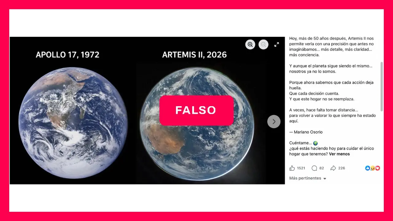 - Circulan en redes sociales una foto de la Tierra tomada en la misión Apolo XVII (1972) y otra foto capturada por Artemis II. Los posteos dan a entender que en la foto de Artemis II la Tierra tiene menos brillo por la actividad humana, pero el brillo se debe a la cámara que se usó en cada caso y la posición del Sol.