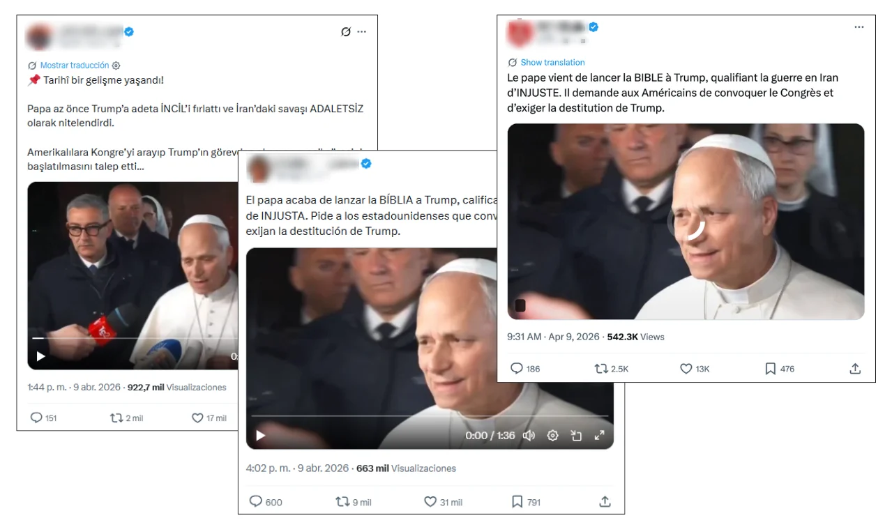 El análisis realizado por Maldita.es ha permitido recopilar un total de 74 publicaciones que acumulan más de 11 millones de visualizaciones. El español es el idioma más presente en los mensajes que difunden estas narrativas, seguido del inglés, el turco y en menor medida aparece el francés y el portugués. La narrativa más difundida en X ha sido la supuesta amenaza del Pentágono al Vaticano tras el posicionamiento del papa León XIV en contra de la guerra en Irán, que acumula más de 8.500.000 visualizaciones.