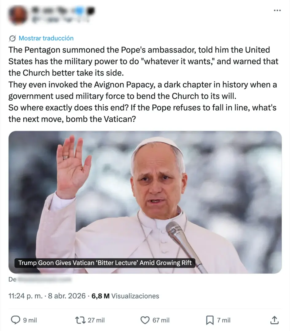 El 8 de abril a las 11:24h una publicación en inglés con más de 6 millones de visualizaciones compartió la narrativa que afirma sin pruebas que el Pentágono ha amenazado al Vaticano diciéndole que “tiene poder militar para hacer lo que quieran”. Esta narrativa acumula más de 8,5 millones de visualizaciones entre las 47 publicaciones detectadas en X entre el 8 y el 12 de abril.
