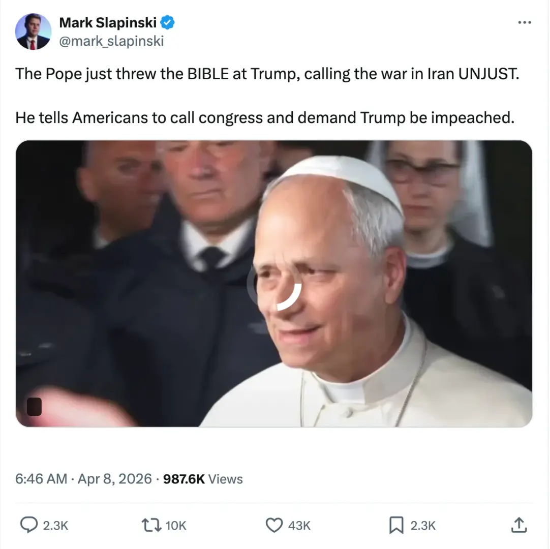 La primera narrativa desinformadora que detectamos es la que afirma que el papa León XIV ha pedido a los estadounidenses que convoquen al Congreso de EE.UU. para exigir la destitución de Trump por la guerra en Irán. El primer registro de esta narrativa en X que Maldita.es ha identificado es del 8 de abril a las 6:46h (hora peninsular) en una publicación en inglés que acumula más de 980.000 visualizaciones.