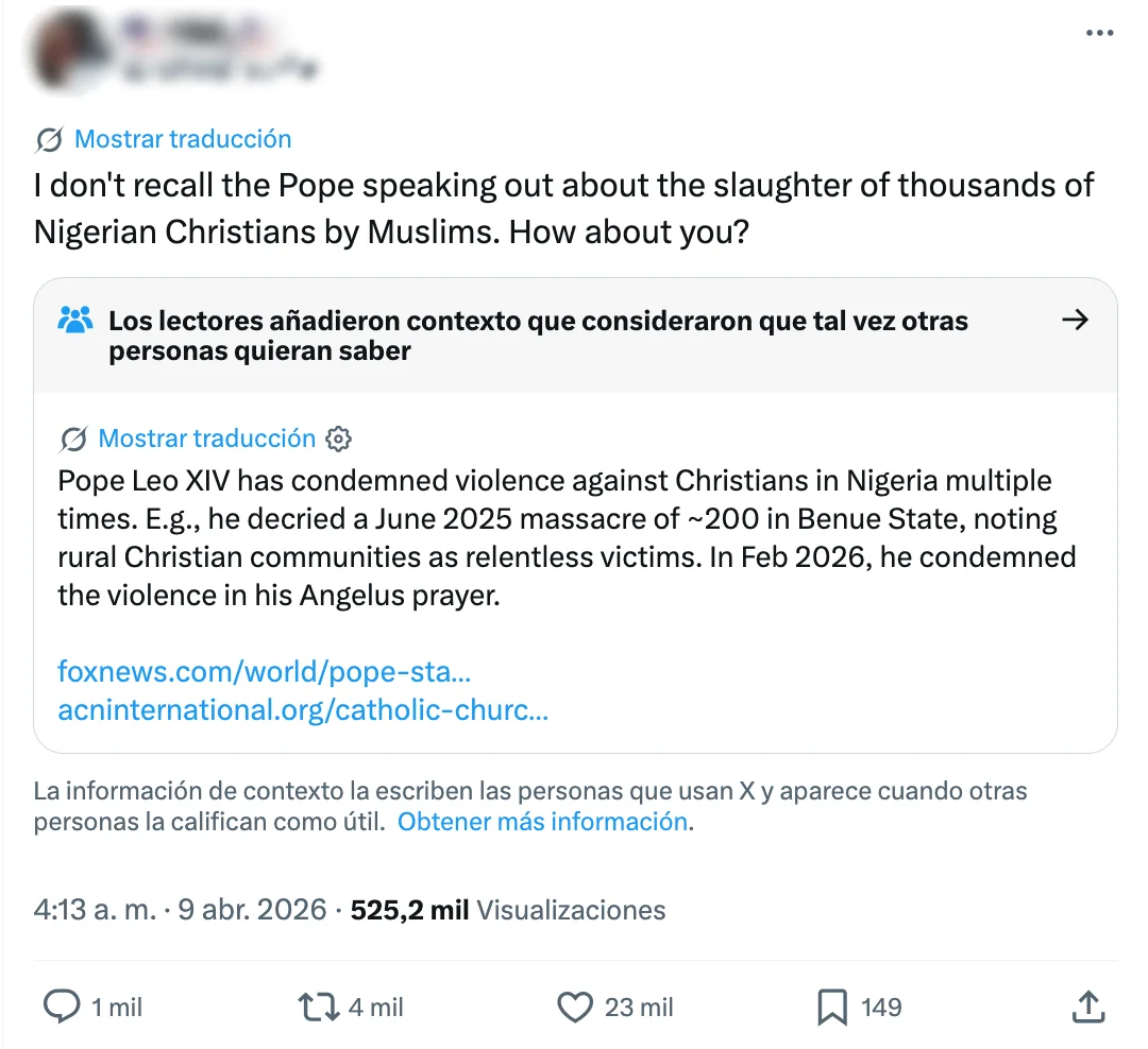 En el contexto de los ataques de Trump al papa León XIV, también han circulado contenidos que difunden la falsa idea de que el pontífice no se ha pronunciado sobre el asesinato de cristianos en Nigeria. Esta narrativa desinformadora acumula más de 500.000 visualizaciones entre el 9 de abril y el 14 de abril y solo uno de los mensajes detectados cuenta con una nota de la comunidad que afirma que “el papa León XIV ha condenado la violencia contra los cristianos en Nigeria en múltiples ocasiones”.