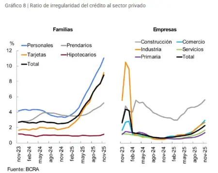 En términos generales, el ratio de irregularidad del crédito al sector privado llegó al 5,5% sobre el total, según el Informe de Bancos de diciembre de 2025 (último dato publicado). En ese contexto, la deuda de los hogares ascendió a 9,3% mientras que la morosidad de las empresas se situó en 2,5%.