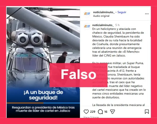 - También se viralizó un video de la presidenta de México, Claudia Sheinbaum, bajando a un buque, pero no es actual. Y una imagen de un avión incendiado en el aeropuerto de Guadalajara que presenta indicios de haber sido generada con IA.