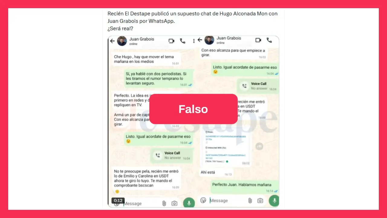 Otro contenido que circula es una captura de pantalla de un supuesto chat de WhatsApp entre el diputado nacional Juan Grabois (Fuerza Patria), querellante en el caso $LIBRA, y el periodista de La Nación, Hugo Alconada Mon. En la captura viral, Grabois presuntamente le pide a Alconada Mon “mover el tema en los medios”.