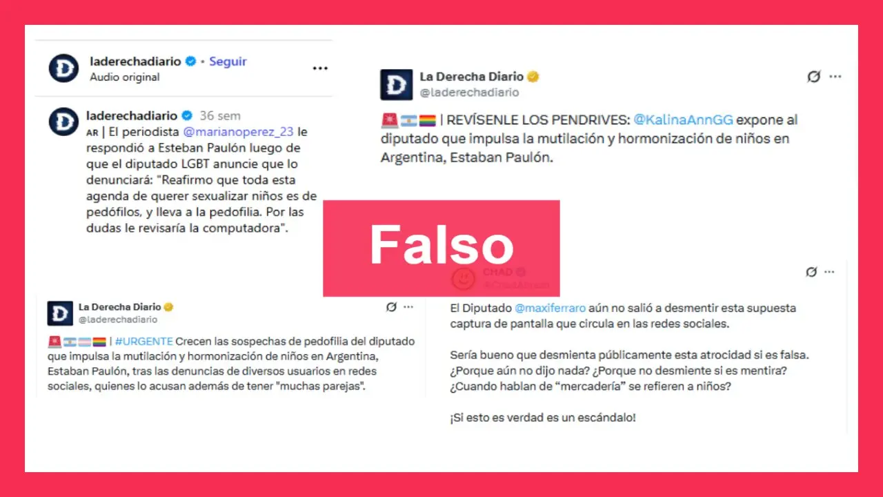 Además, en el marco de la investigación por el Caso $LIBRA, desde La Derecha Diario publicaron posteos donde se vincula a los diputados Esteban Paulón (Provincias Unidas) y Maximiliano Ferraro (Coalición Civica) con la pedofilia. Sin embargo, no existen causas en la Justicia nacional especializada en el tema.