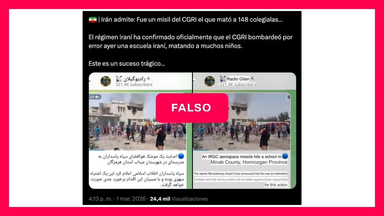 Circula en redes sociales varios posteos que señalan: “El régimen iraní ha confirmado oficialmente que el CGRI bombardeó por error ayer una escuela iraní, matando a muchos niños”. El contenido agrega que esto ocurrió supuestamente en una escuela en Minab, en el sur del país, el 28 de febrero de 2026.