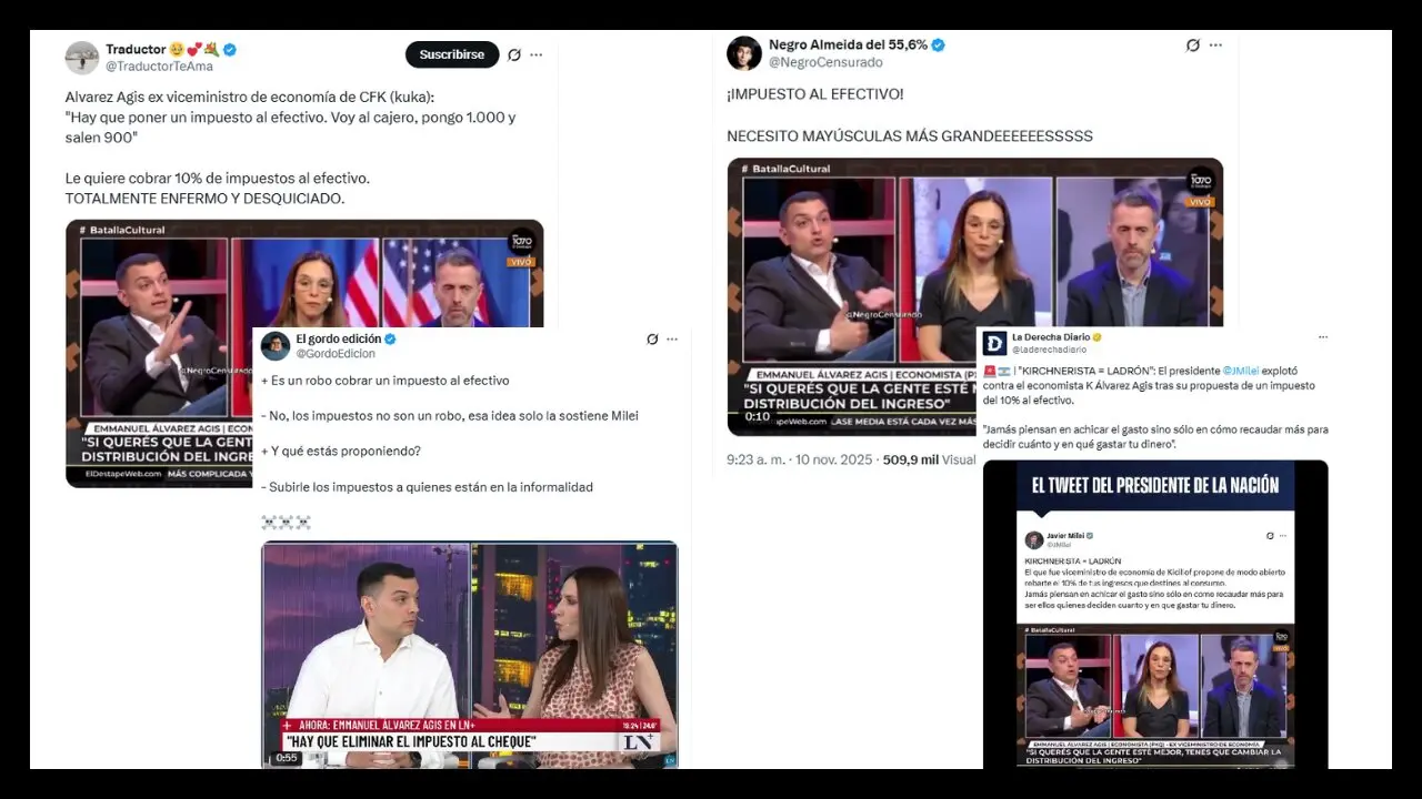Uno de los primeros recortes se viralizó el lunes 10 a las 9:23 horas con un tuit del usuario de X “Negro Almeida del 55,6%” (@NegroCensurado). “¡IMPUESTO AL EFECTIVO! NECESITO MAYÚSCULAS MÁS GRANDEEEEEESSSSS”, señaló el posteo, que obtuvo más de 5 mil “Me gusta” y 509 mil visualizaciones.