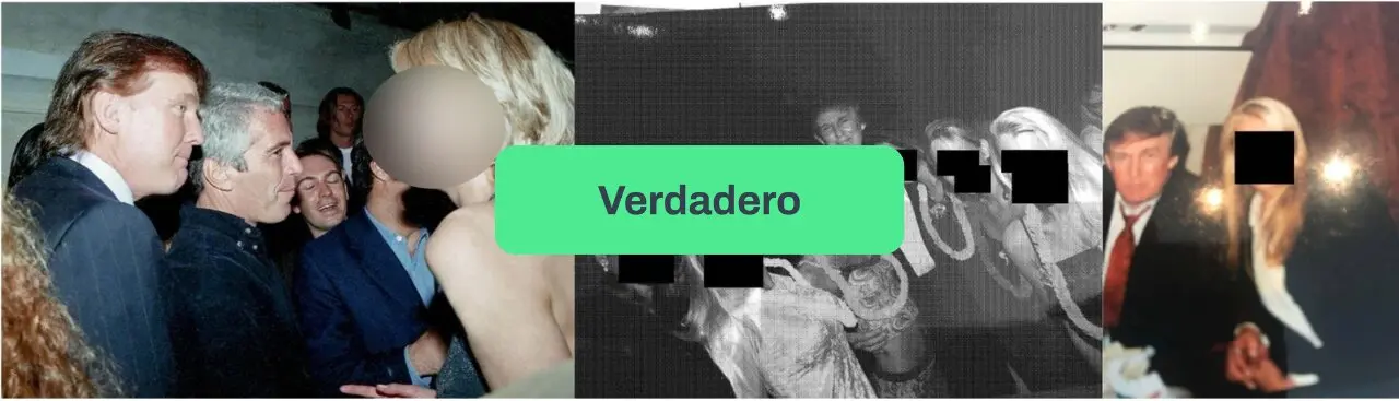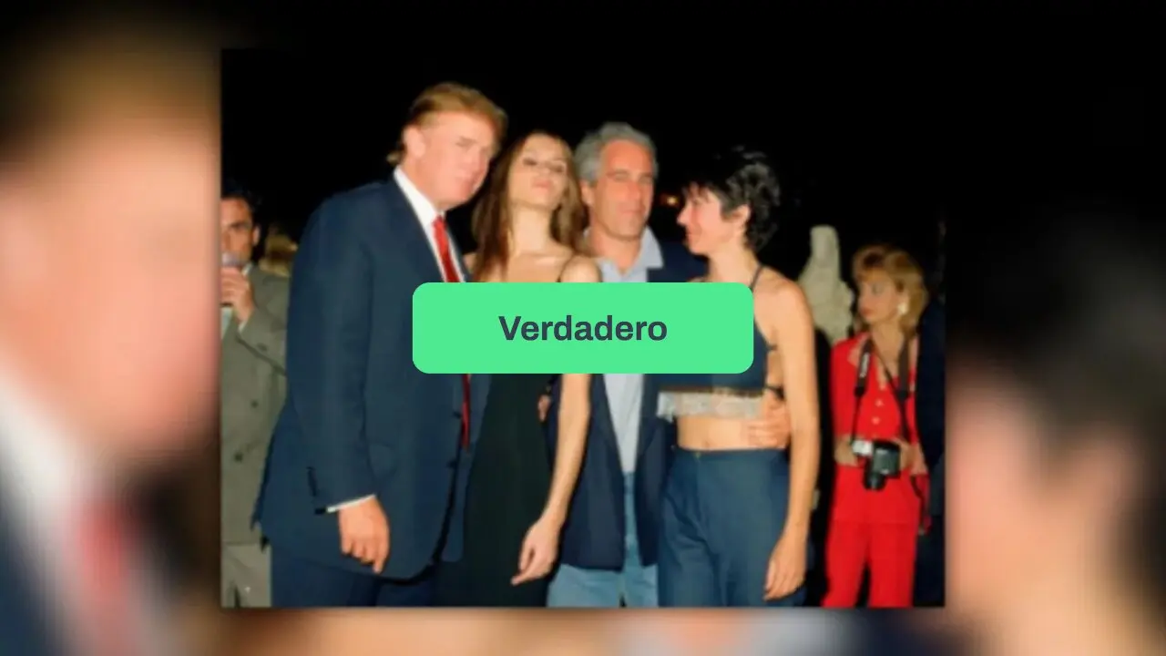 En otra fotografía aparecen Donald Trump con su pareja Melania, junto a Epstein y Ghislaine Maxwell, socia y expareja del magnate. Esta foto es real: se puede ver en el archivo de la agencia Getty Images. Se tomó en el resort de Trump de Florida, Mar-a-Lago, el 12 de febrero del 2000. Hay otras fotos similares de los cuatro.