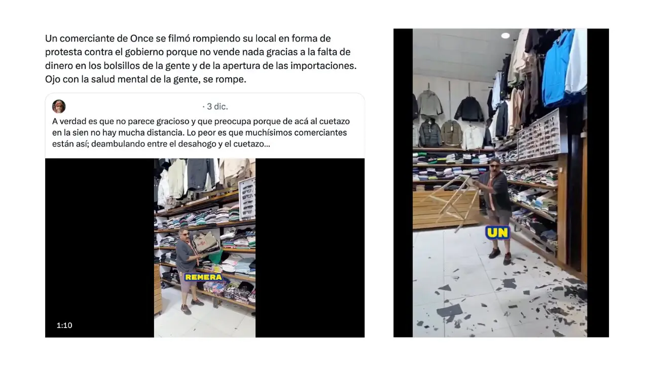“Un comerciante de Once se filmó rompiendo su local en forma de protesta contra el gobierno porque no vende nada gracias a la falta de dinero en los bolsillos de la gente y de la apertura de las importaciones. Ojo con la salud mental de la gente, se rompe”, afirma una publicación en X.