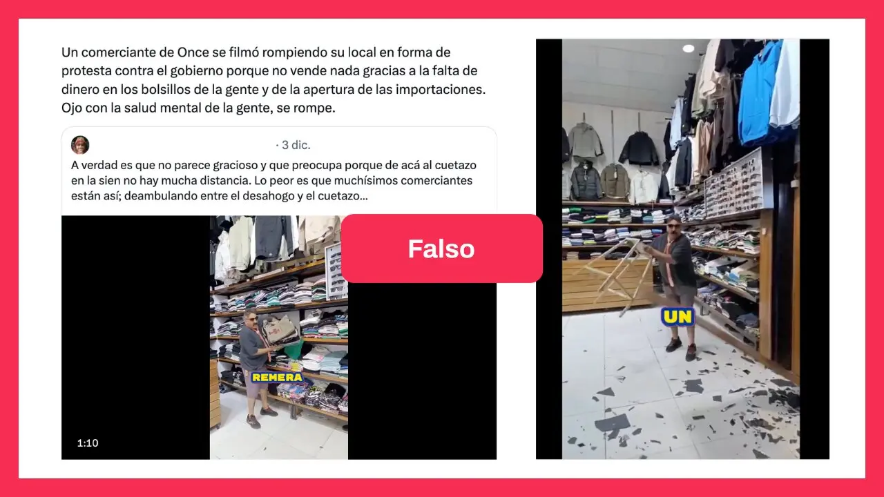 Circula en redes sociales un video que muestra a un presunto comerciante destruyendo el interior de un local de indumentaria porque “no está vendiendo nada”. Según los posteos, esto habría ocurrido en el barrio de Once, en la Ciudad de Buenos Aires.