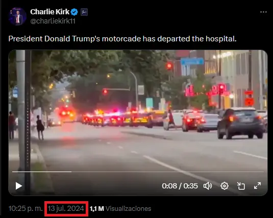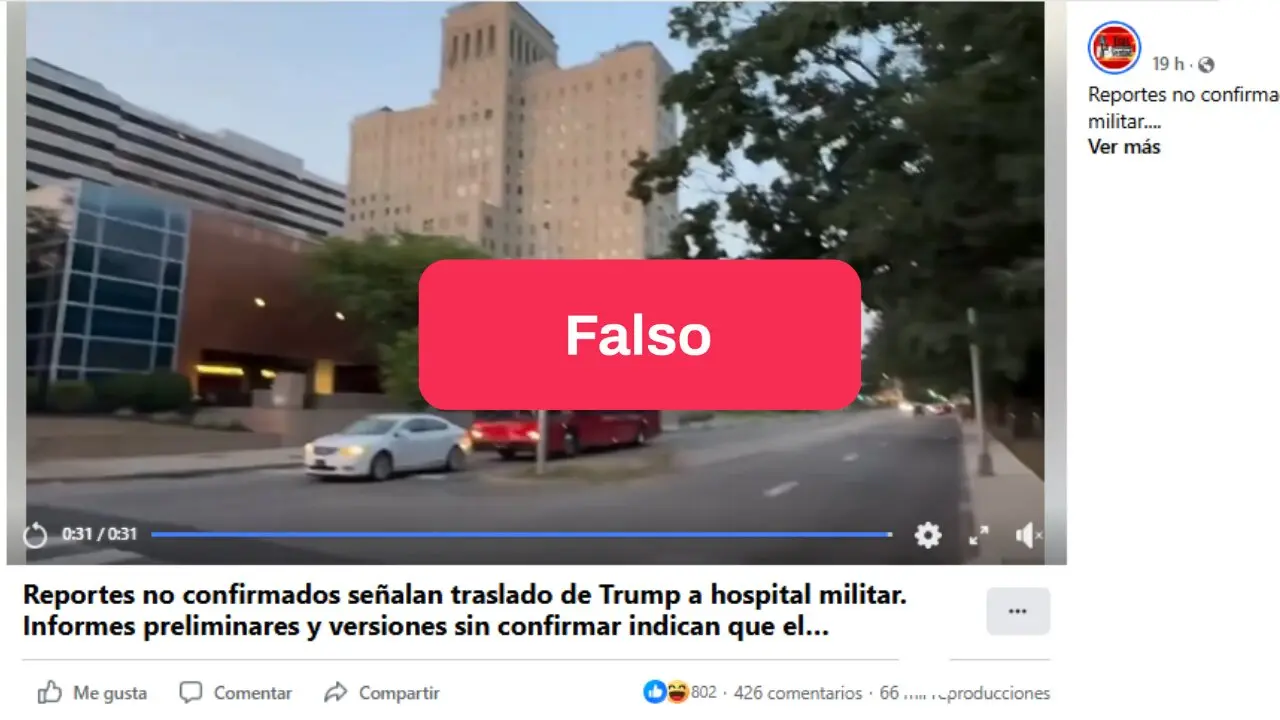 Sin embargo, las imágenes no corresponden a este fin de semana ni fueron registradas en el hospital Walter Reed. El video fue grabado originalmente en julio de 2024, cuando Donald Trump abandonaba un centro médico en Butler, Pensilvania, luego de ser atendido por un disparo recibido durante un acto de campaña.