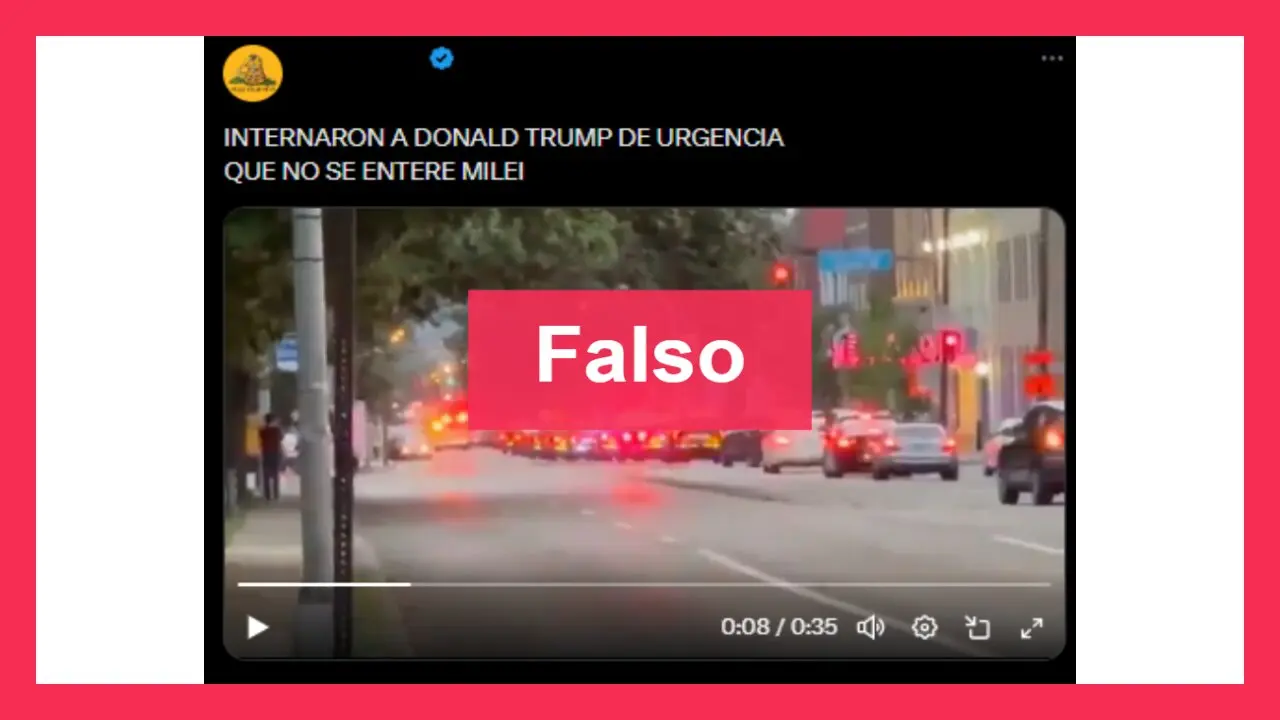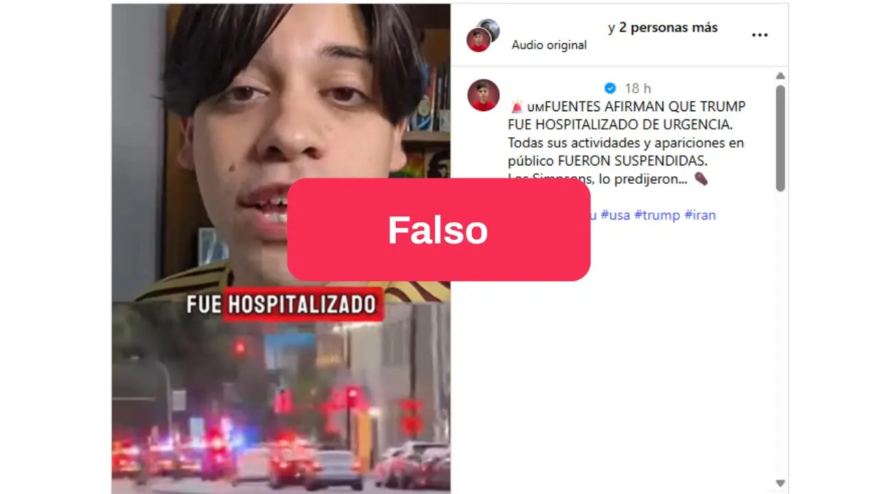 Este contenido circuló inicialmente en inglés y fue compartido luego por usuarios de habla hispana en distintas redes. Así, un posteo en castellano realizado en X alcanzó mil reposteos, 6 mil “me gusta” y más de 230 mil visualizaciones. Por su parte, una publicación del mismo contenido en Facebook tuvo 64 mil reproducciones, y un posteo de Instagram que incluye el video recibió casi 80 mil “me gusta”. En todos se afirma que Trump fue hospitalizado de urgencia este fin de semana.