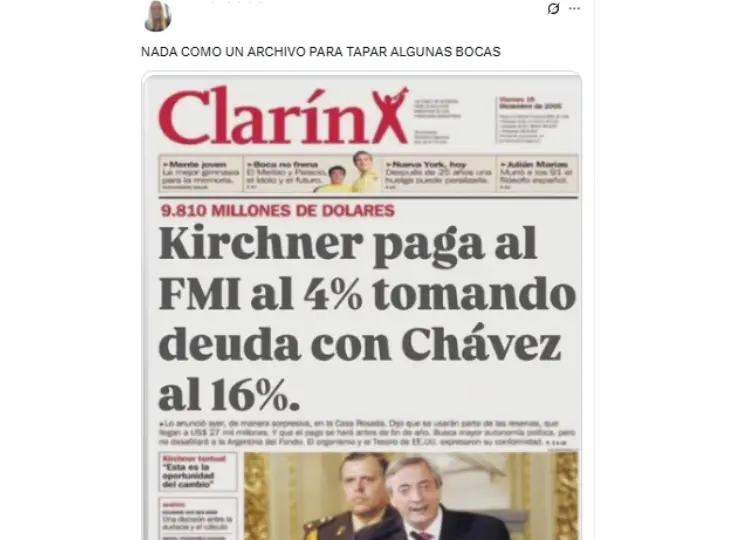 Los mensajes, publicados en X , muestran una tapa del diario Clarín cuyo título principal afirma (con una tipología de letra diferente a la que tradicionalmente utiliza el diario): “Kirchner paga al FMI al 4% tomando deuda con Chávez al 16%”.